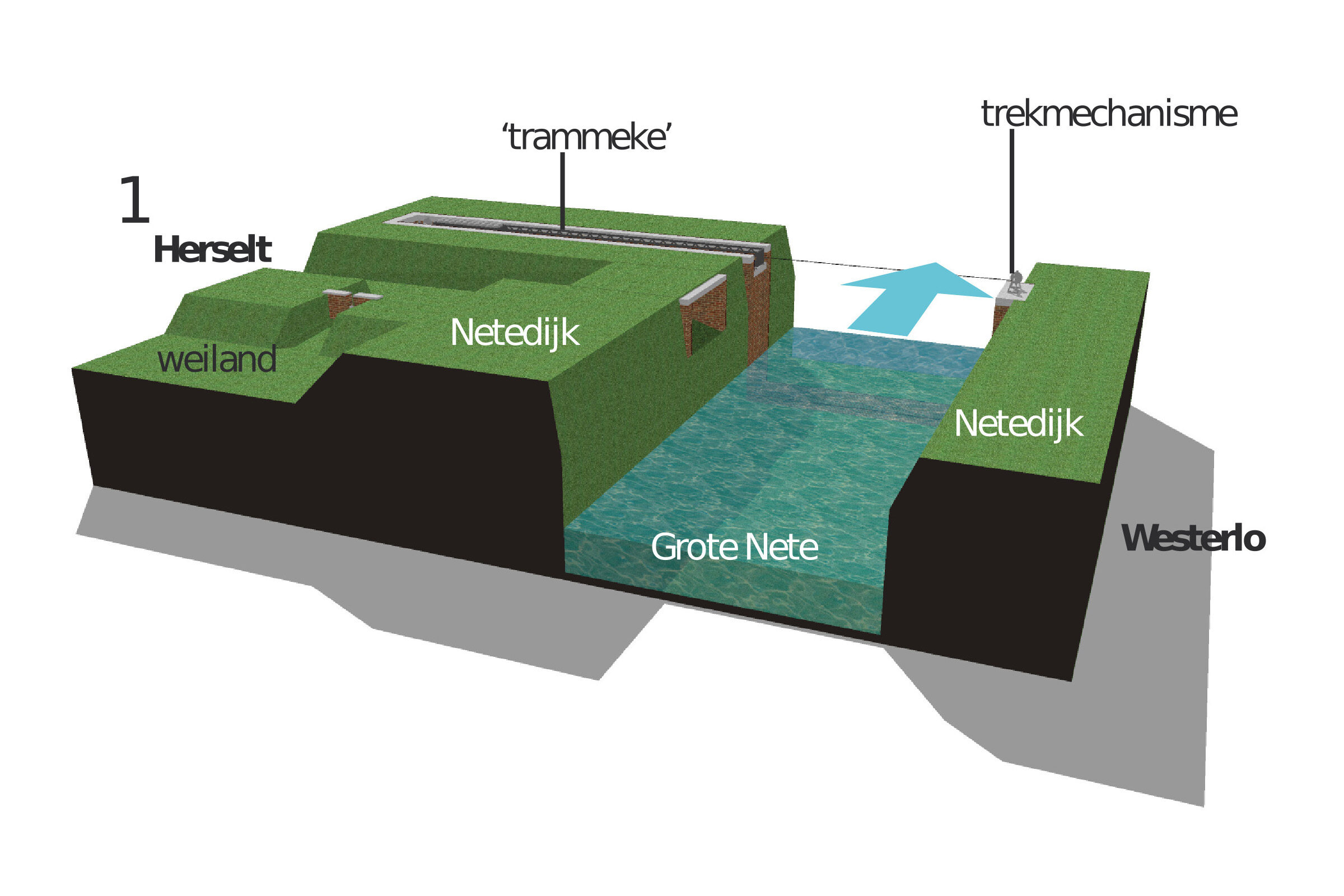 1. Het Trammeke bestaat uit twee delen. Aan de Netekant van Herselt (linkeroever) ligt het zogenaamde ‘Trammeke’. Aan de kant van Westerlo bevindt zich het trekmechanisme.