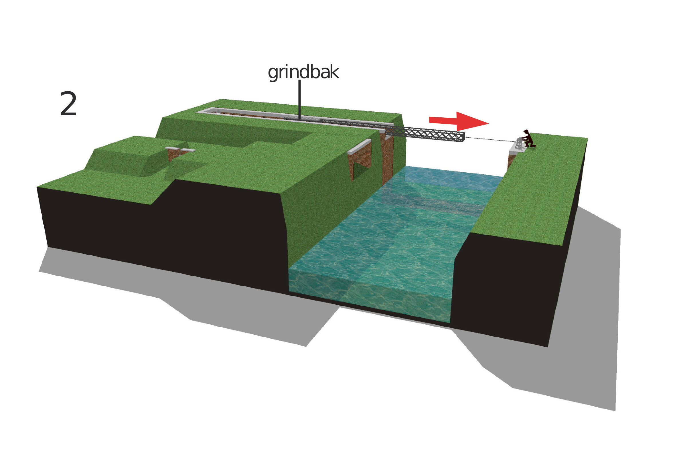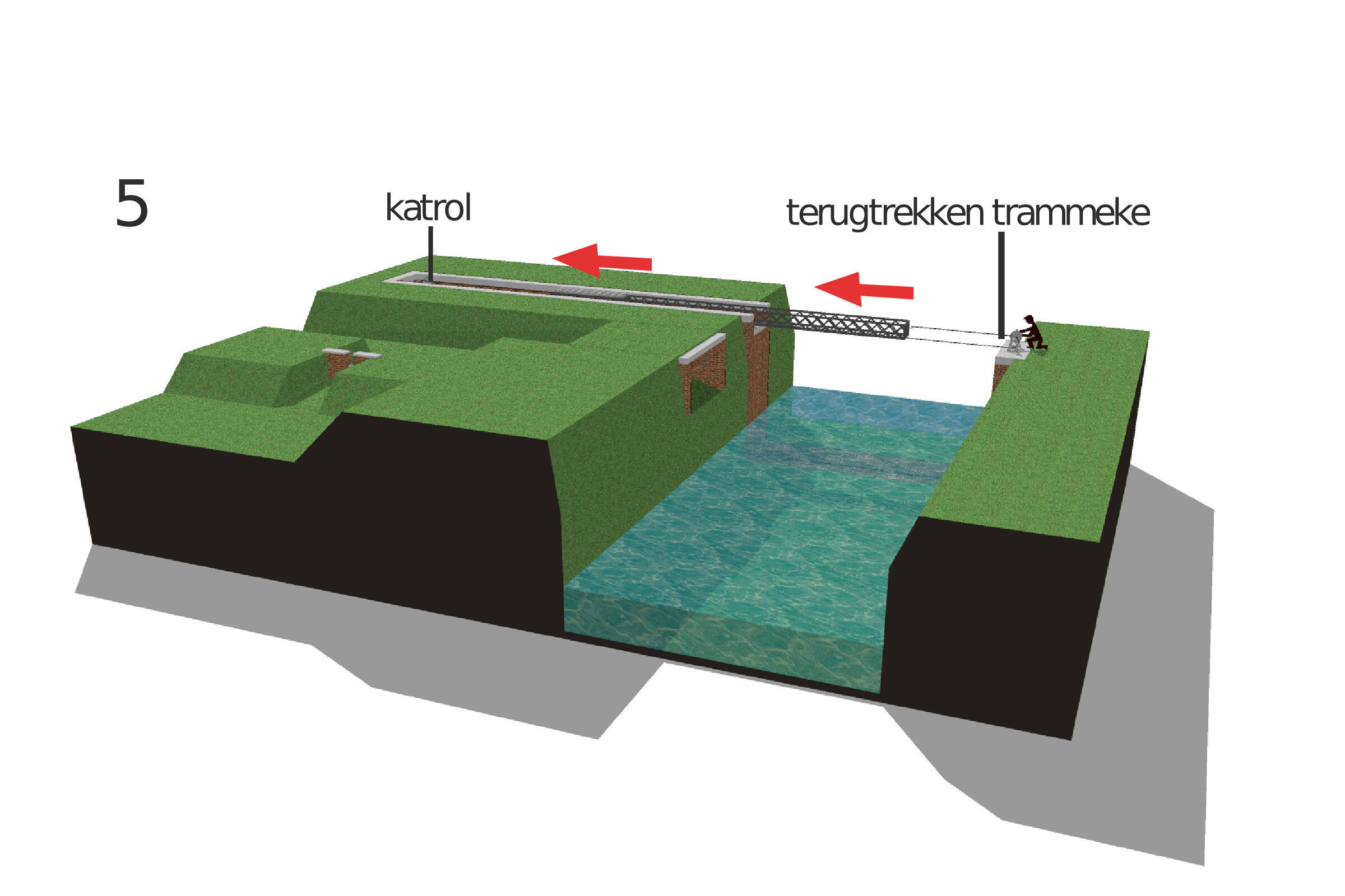 2. Met dit trekmechanisme werd de lange ijzeren balk over de Grote Nete getrokken en vastgezet op de arduinen blokken aan weerskanten. Houten planken op de ijzeren balk vormden hierbij een loopbrug. De bak aan het uiteinde van de balk werd gevuld met grind als tegengewicht. De iets hogere plaatsing van het trekmechanisme voorkwam tevens dat de ijzeren balk de Grote Nete inzonk.