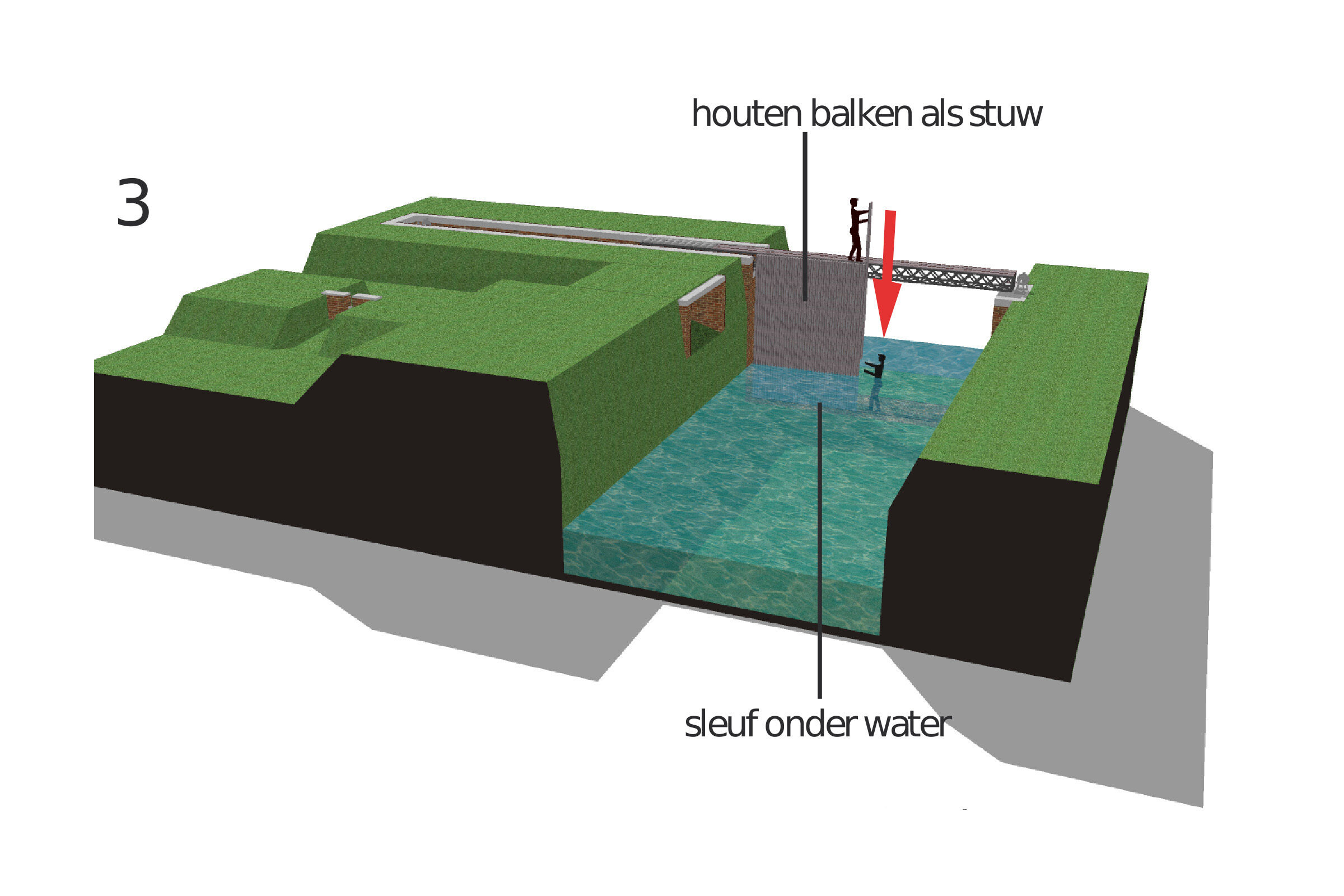 3. Onder het wateroppervlak, op de bodem, bevindt zich een sleuf. Deze werd eerst door een dorpeling vrijgemaakt van stenen en slib. Daarna stak een andere persoon vanop de metalen balk houten balken naar beneden tot in de gleuf. De druk van de stroming zorgde ervoor dat de houten balken in de gleuf en tegen de metalen balk bleven staan.